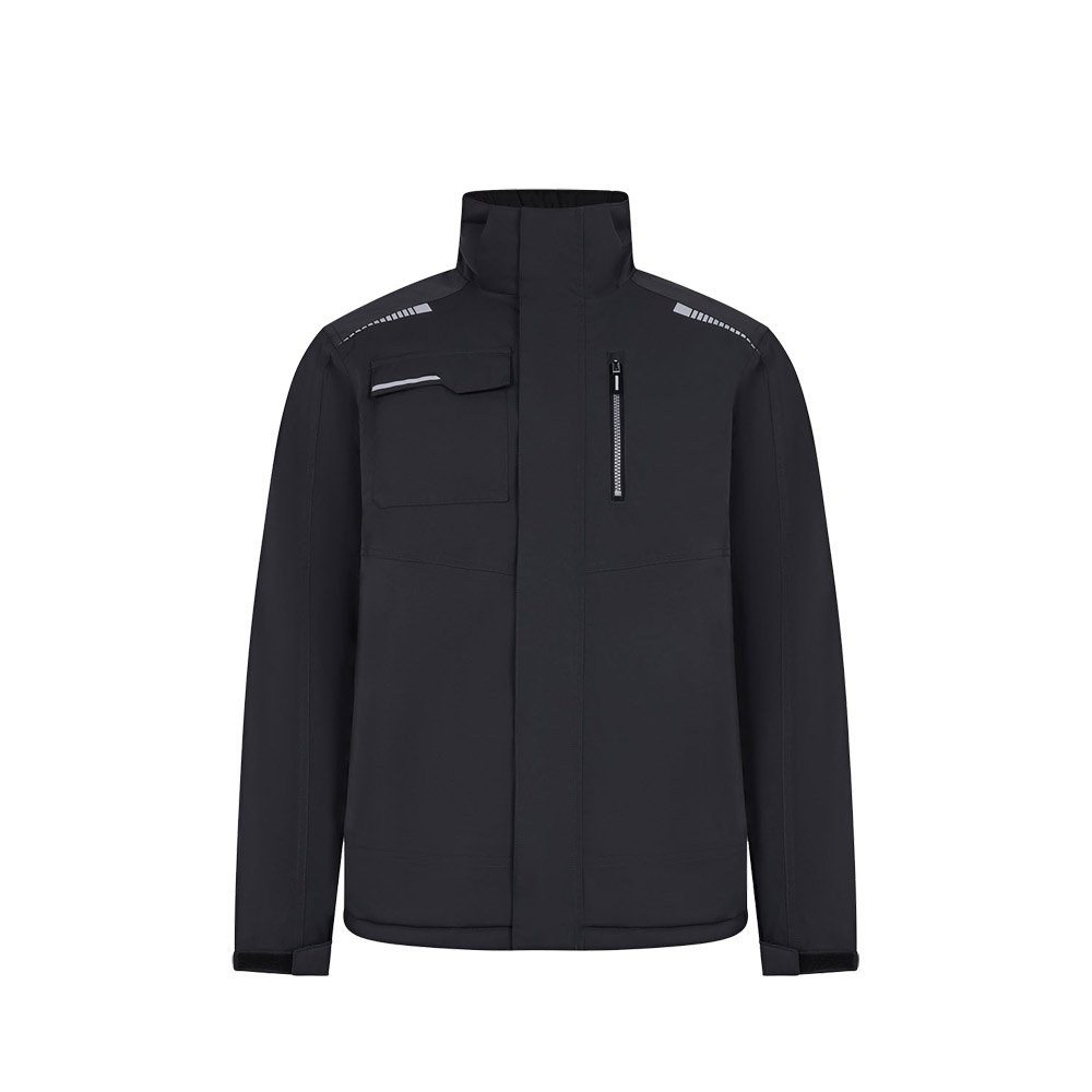 Gepolsterte Jacke (180 g/m²), aus recyceltem Polyester (50 %) und Polyester (50 %). Mit wasserabweisendem Stretchmaterial, heißversiegelten Nähten, reflektierenden Details und einem zentralen Reißverschluss. Die Jacke hat verdeckte Knöpfe und fünf Taschen (zwei Seitentaschen, eine Brusttasche links, eine Brusttasche rechts und eine Innentasche). Größen: S, M, L, XL, 2 XL, 3 XL